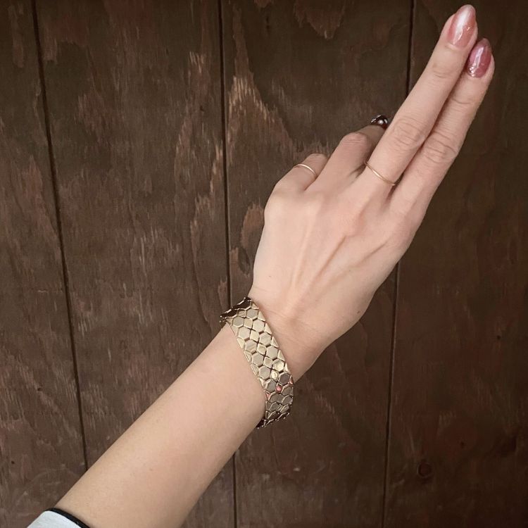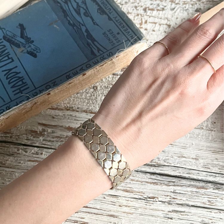 六角形のパーツが連なったアーティスティックなブレスになります。