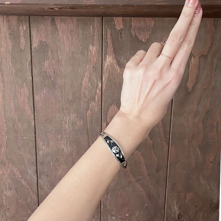 ブラックベースに虹色に輝くシェルインレイを繊細に配したバングルになります。
