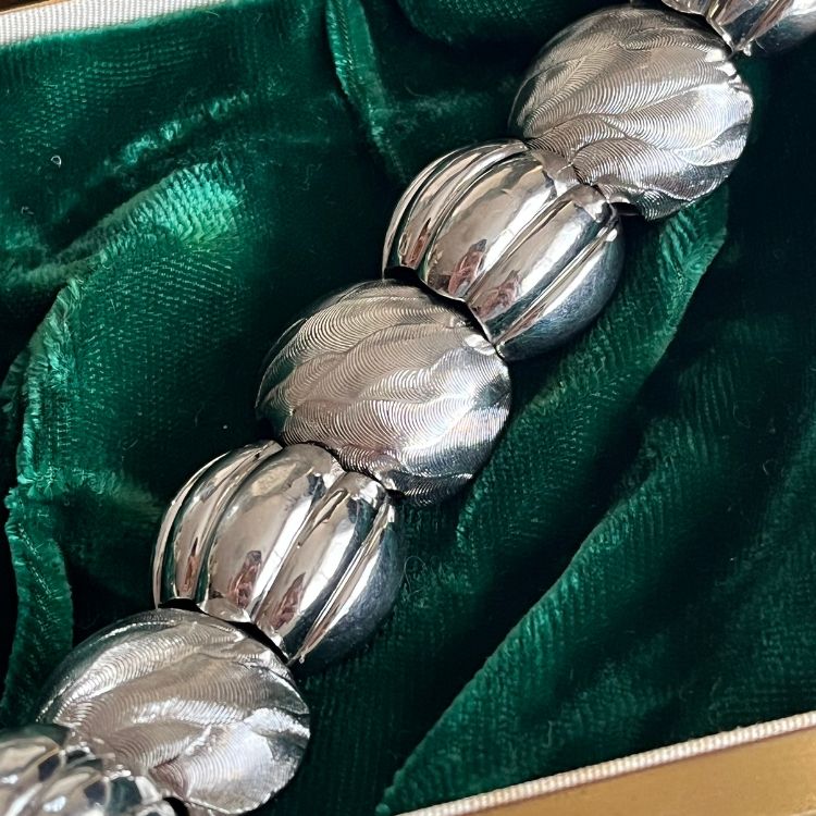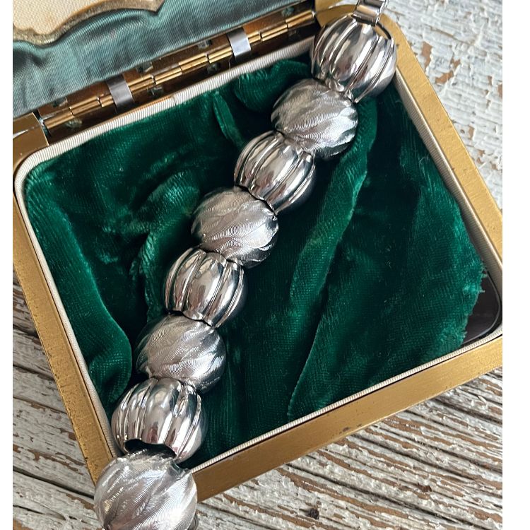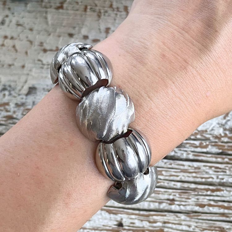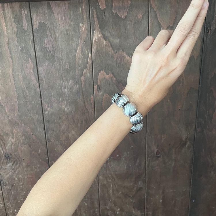 艶あり×マットのぷっくりとしたドーム型のシルバーパーツが連なったブレスになります。