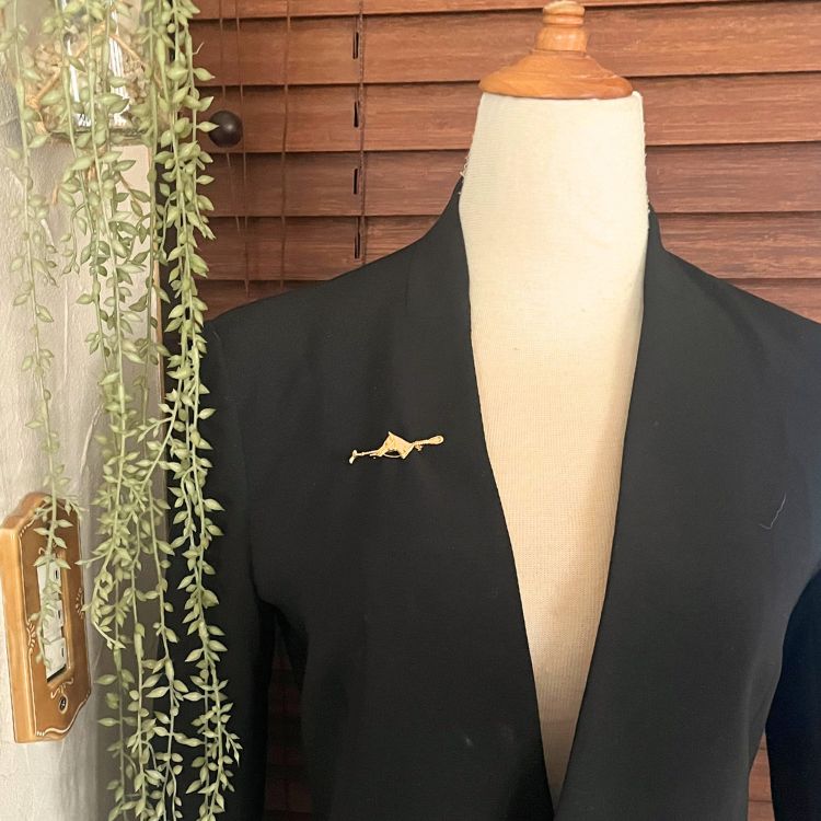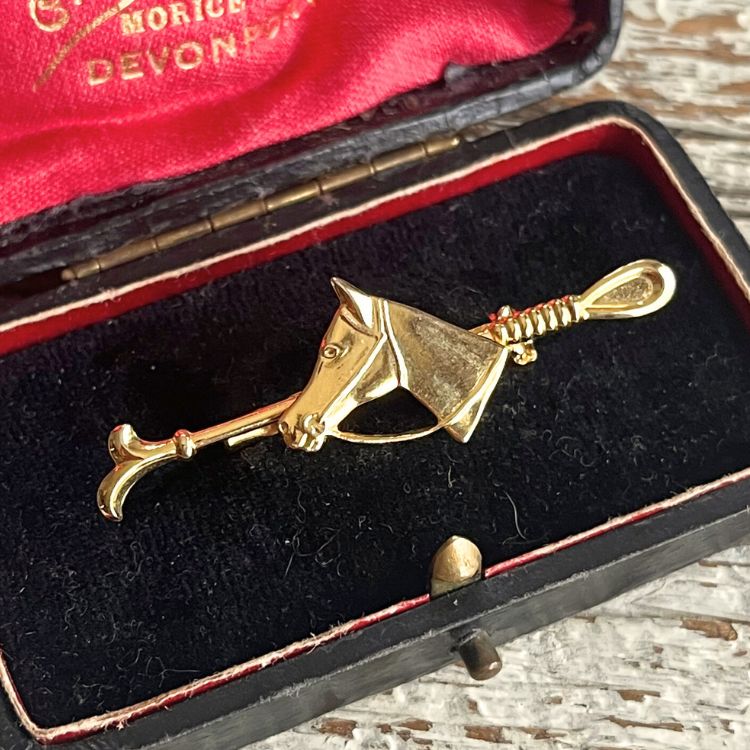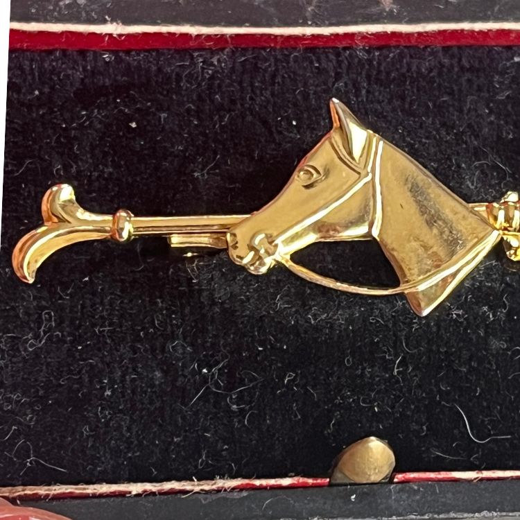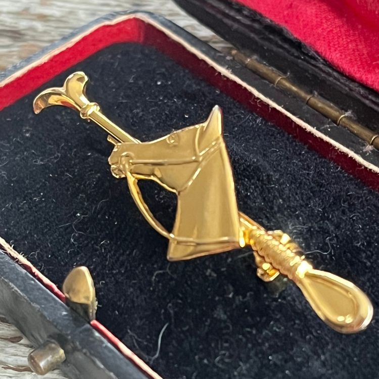 ホースヘッドを中央にして、片側に鞭(ライディングクロップ)、もう片方には拍車(スパー)がデザインされた馬術をテーマにしたブローチになります。