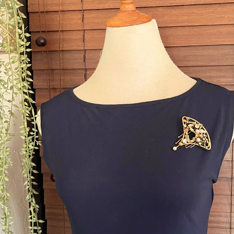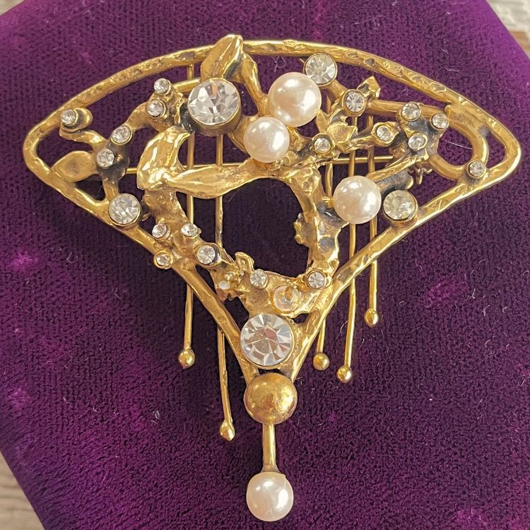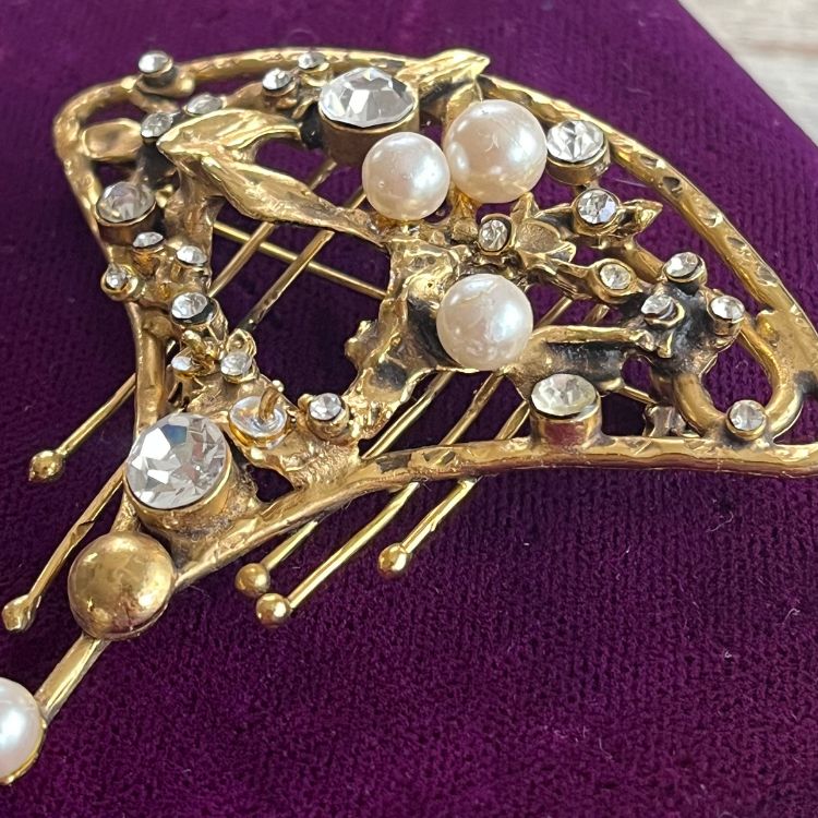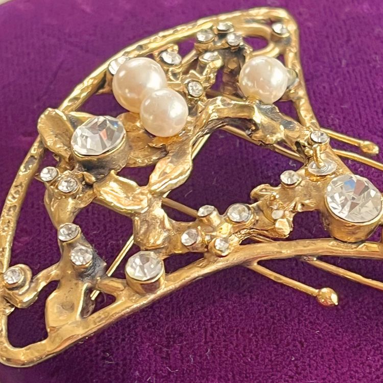 扇形ベースに、パールやビジュがアクセントされたブローチになります。