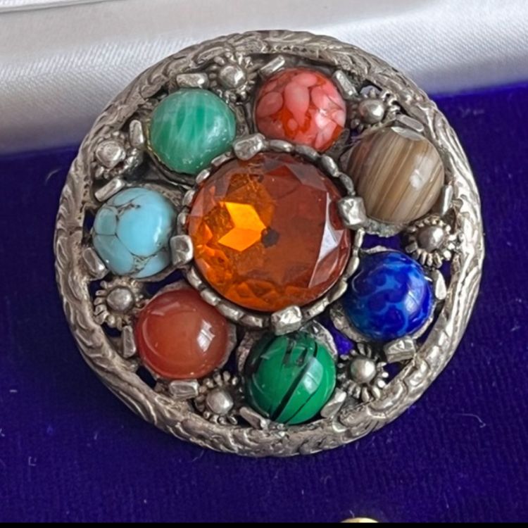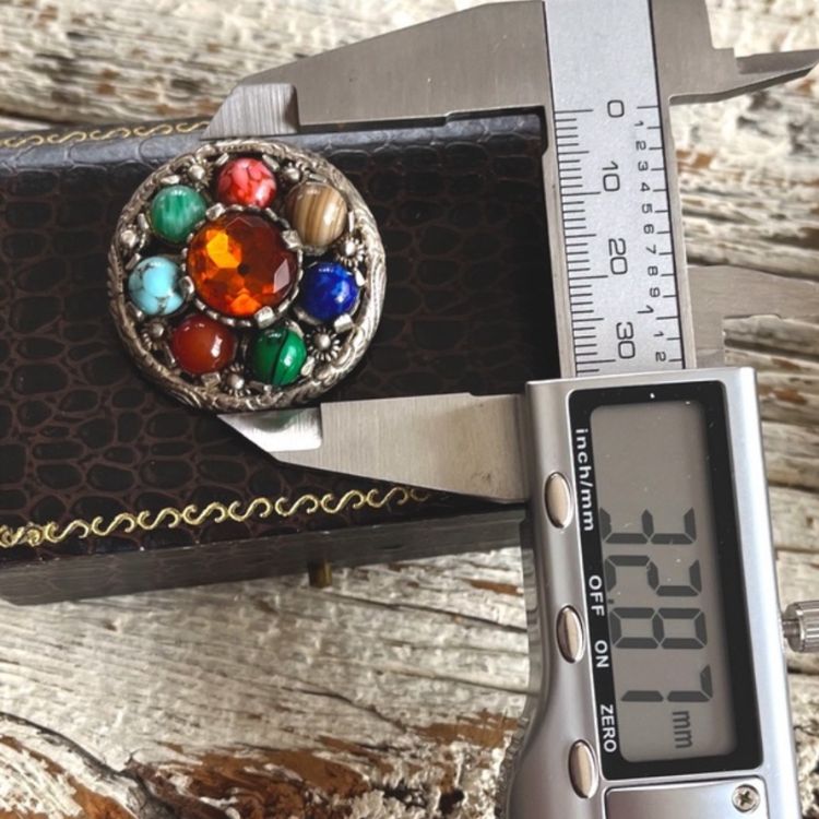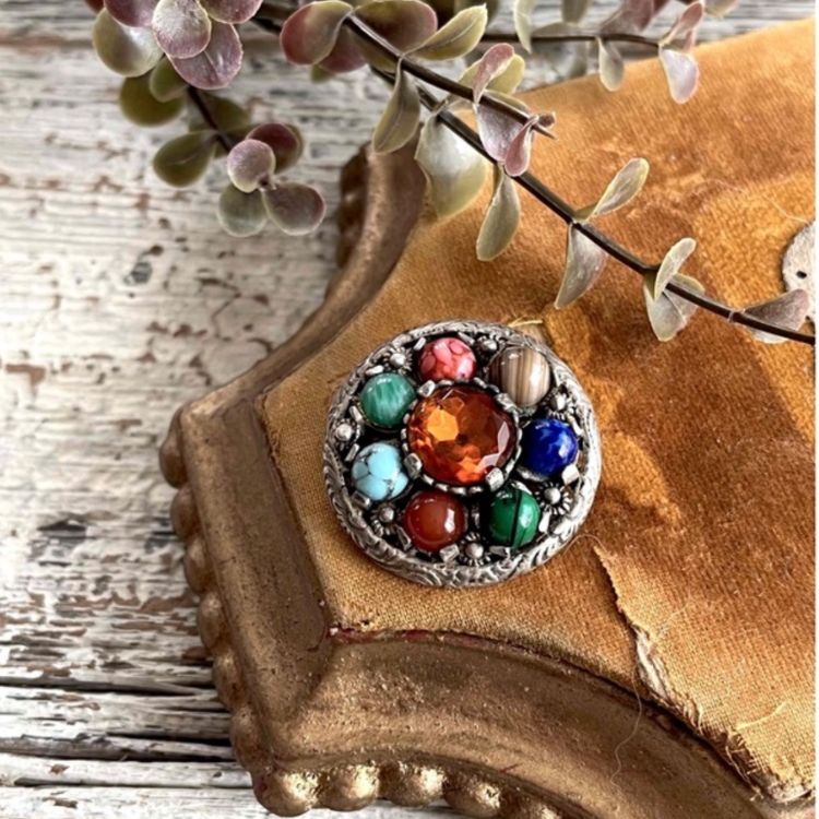 繊細な彫りが入ったメタルベースに、7個の天然石がぐるりと一周アクセントされたブローチになります。