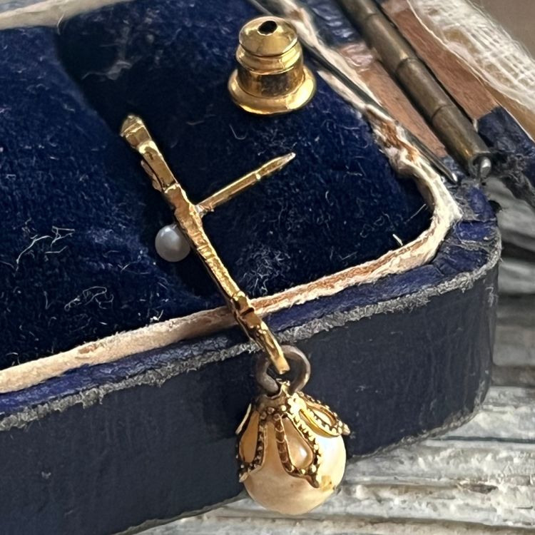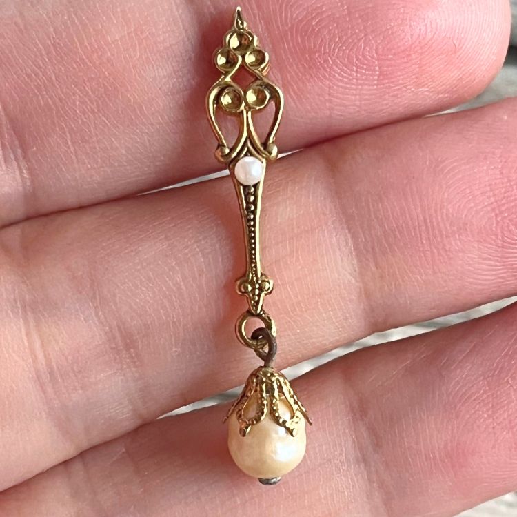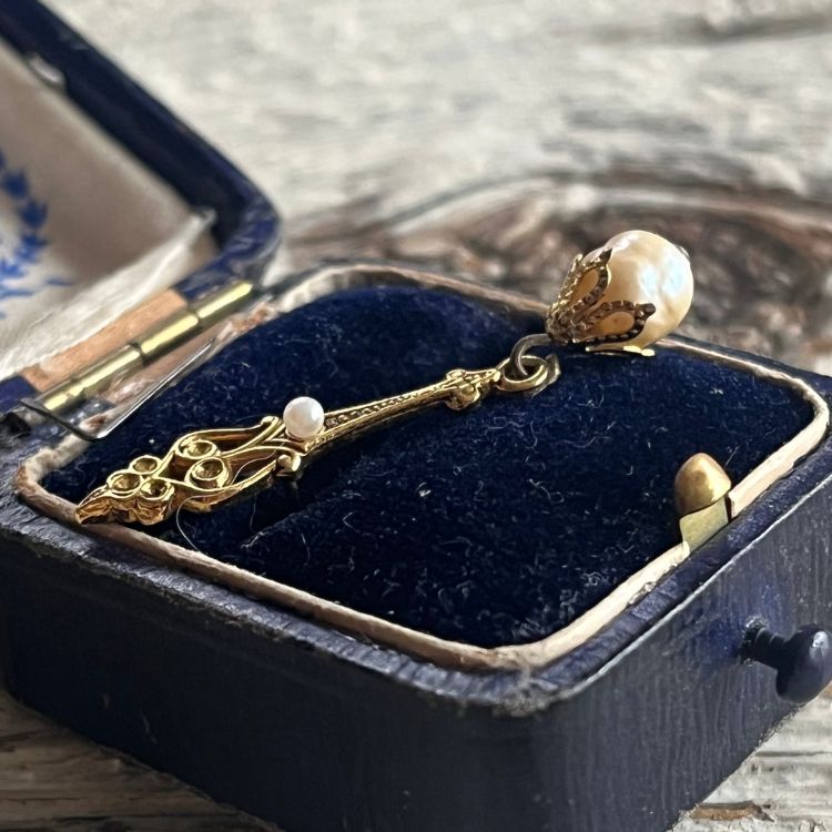 下には凹凸が美しいバロックパールがスイングし、ミニサイズながらしっかり存在感が演出されています。