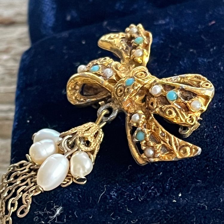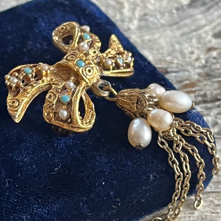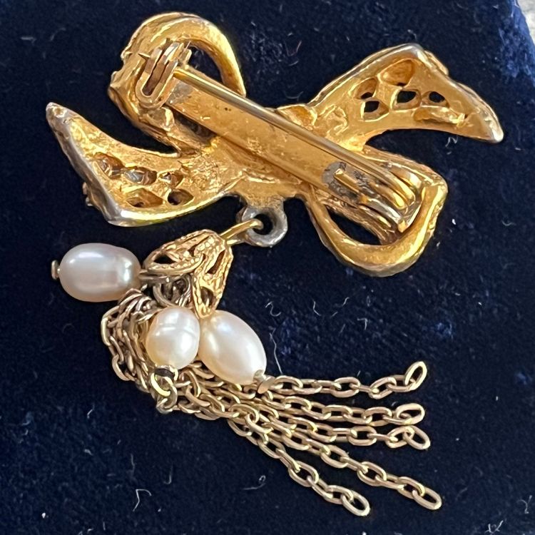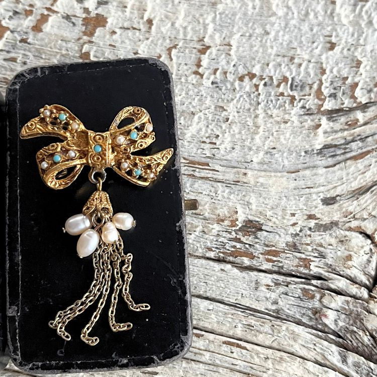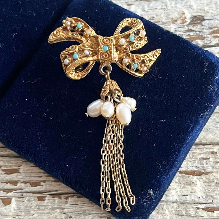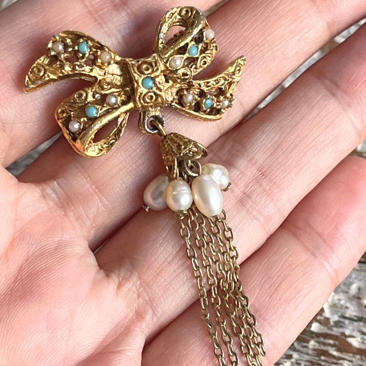 【ブローチ】リボン タッセル バロックパール 50’sイギリスvintage