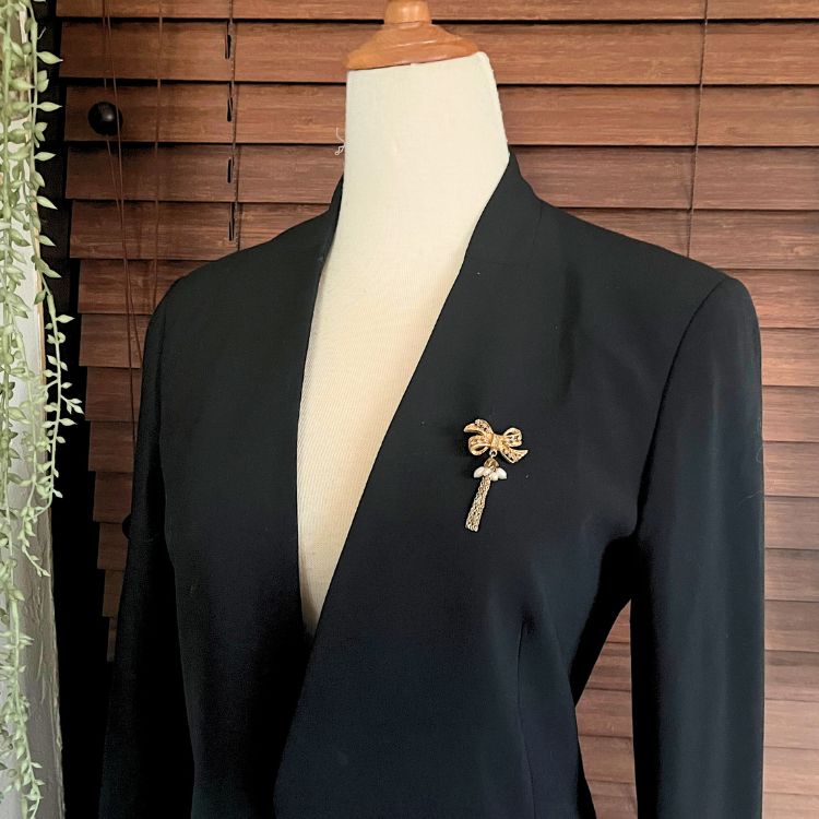 キュッと結んだリボンの下に、4つのバロックパールとドレープチェーンがスイングするブローチになります。