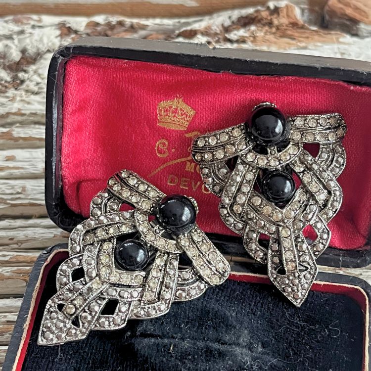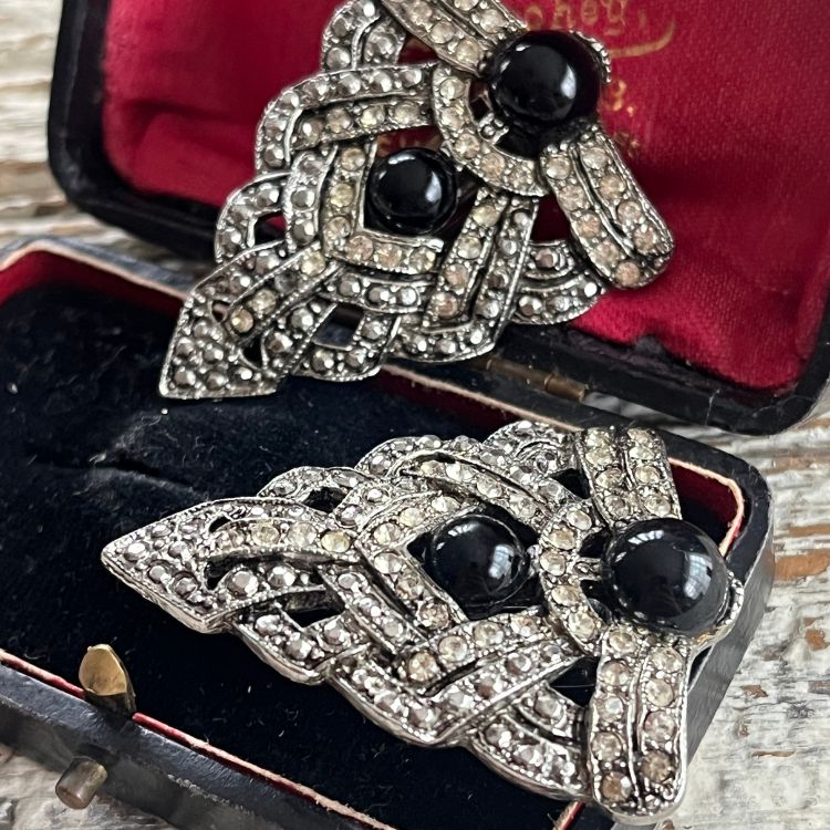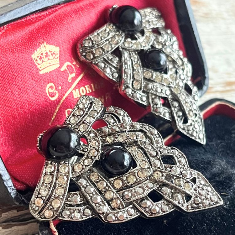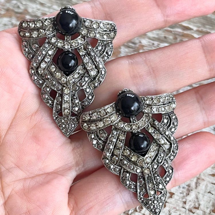 直線的なアールデコ調のクラシカルデザインで、沢山のビジュが輝く中に二つのブラックカボションがアクセントされた逸品です。
