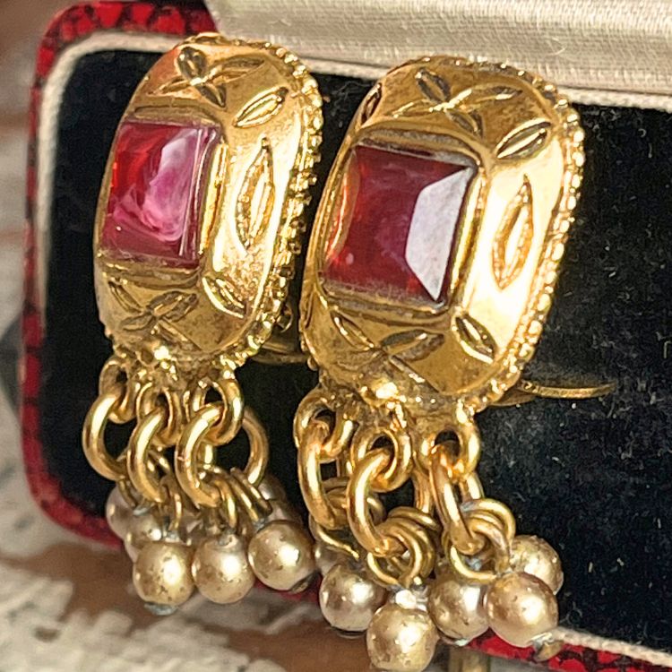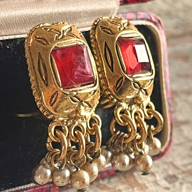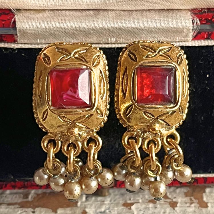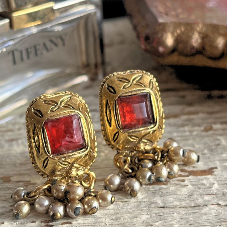 彫りが入ったスクエアフレームに、鮮やかな赤カボションがアクセントされたデザインで、どこかCHANELのグリポアを彷彿させる逸品です。