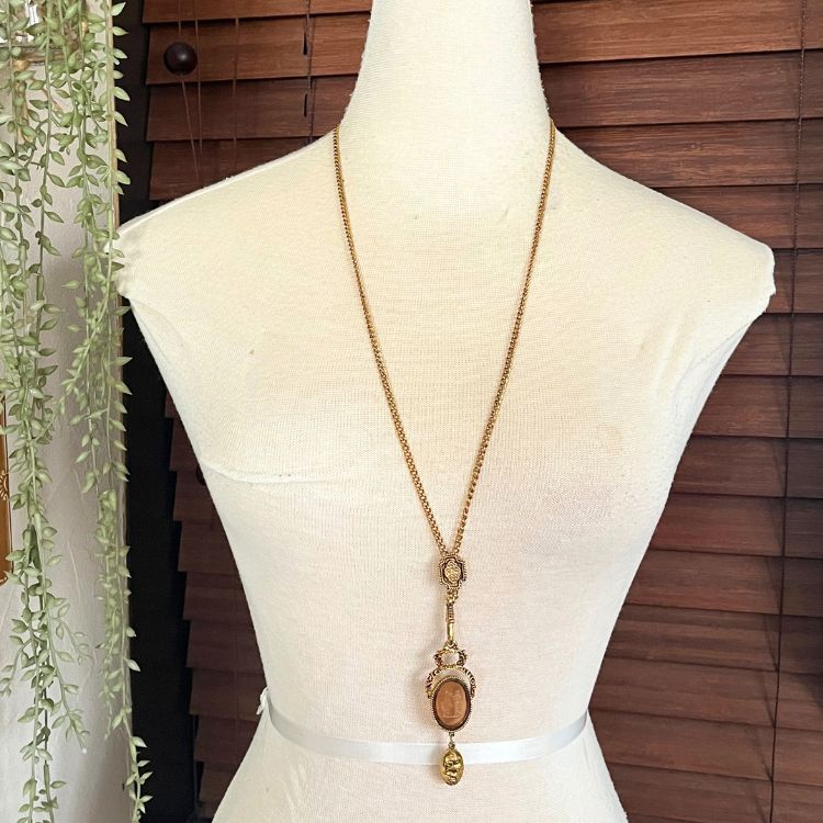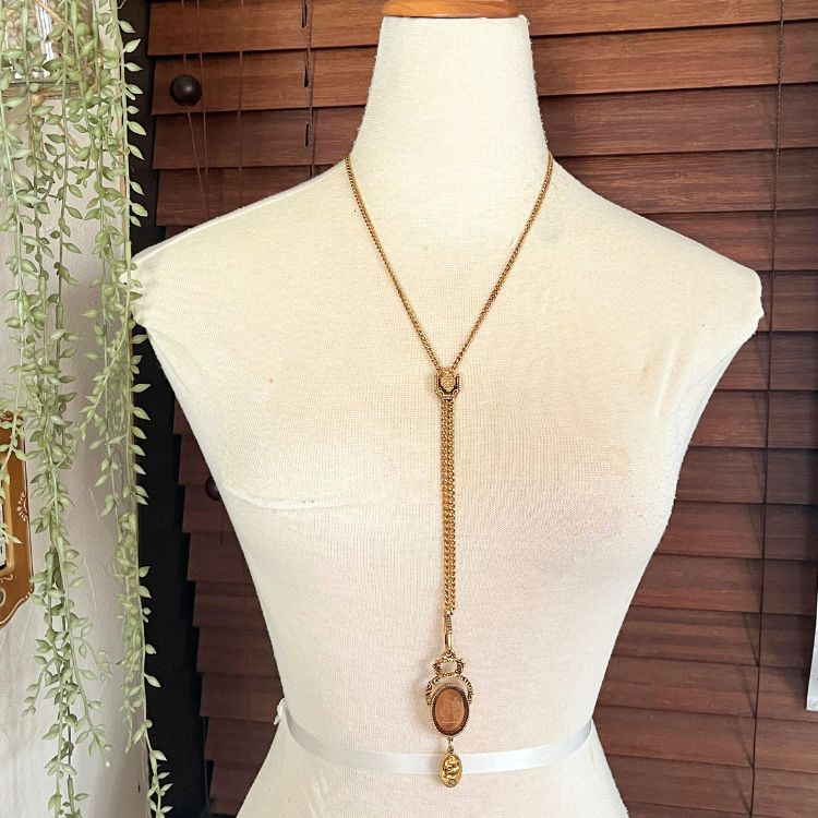 トップの上には、上下に可動するプレートが付いており、トルソーの写真の様に、プレートをスライドさせる位置によってY字になったりロングネックレスの様にしてお楽しみ頂けます。