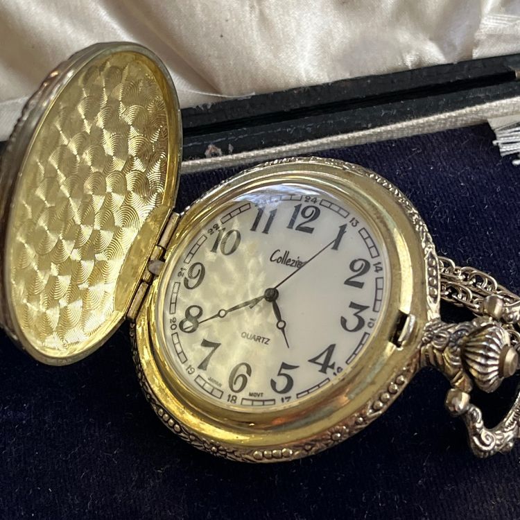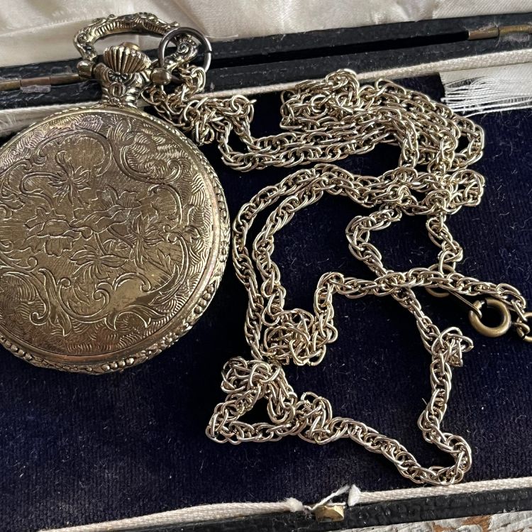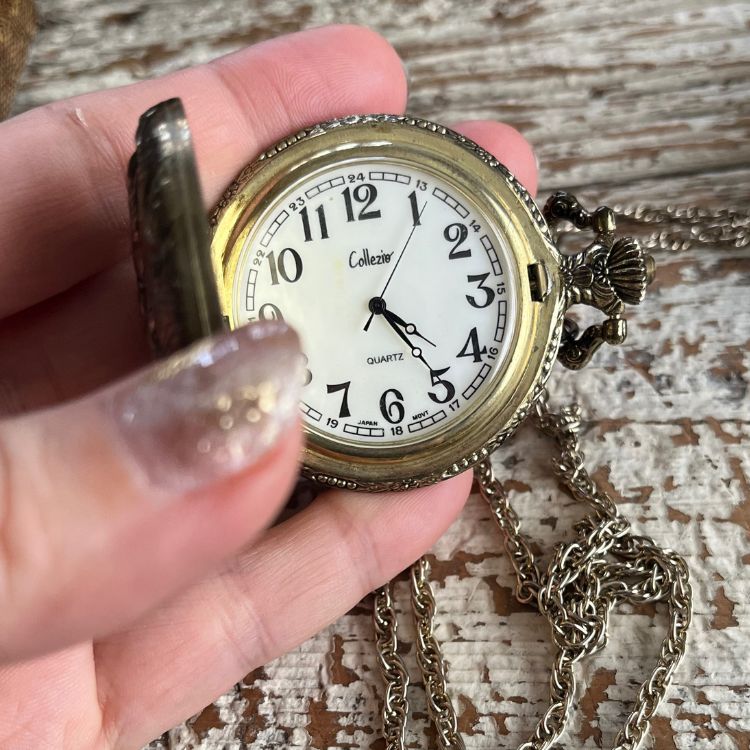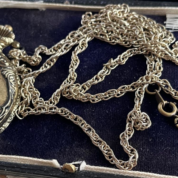 元々は懐中時計でそれ用のポケットチェーンが付いておりましたが、ネックレス用のロングチェーンに替えて首からお供できる様にしました。