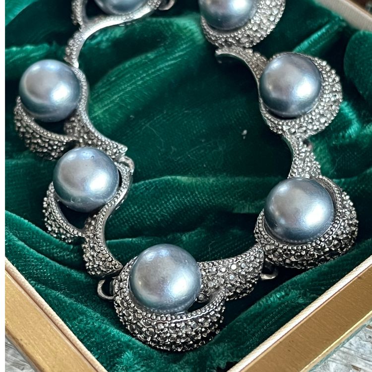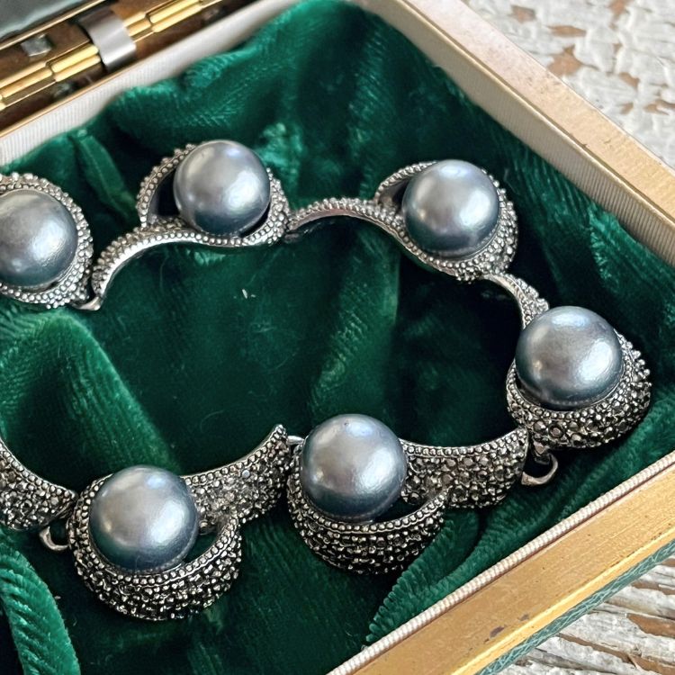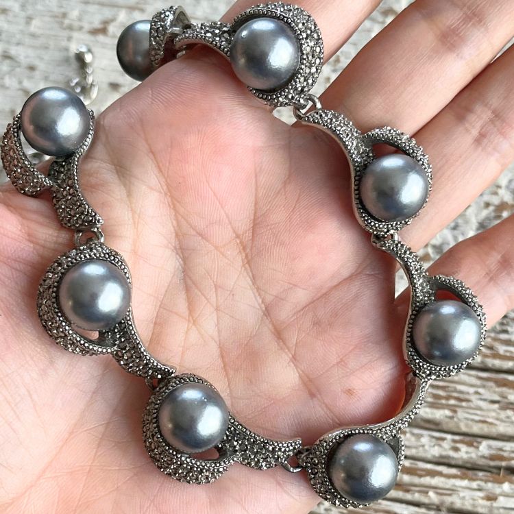 勾玉の様なマーカサイトのフレームに、大粒のブラックパール(Faux)がアクセントされたラグジュアリーな逸品です。