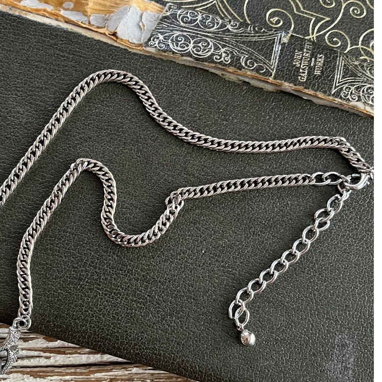 元々このパールのみで首を一周するデザインでしたが、クラシカルになり過ぎるので、チェーンを延長してドレスダウンさせました。