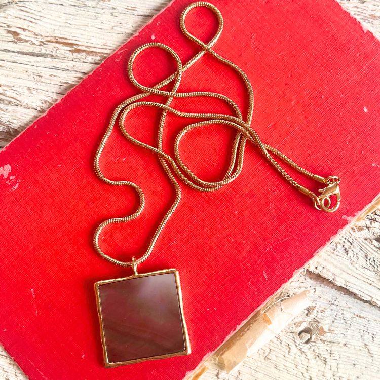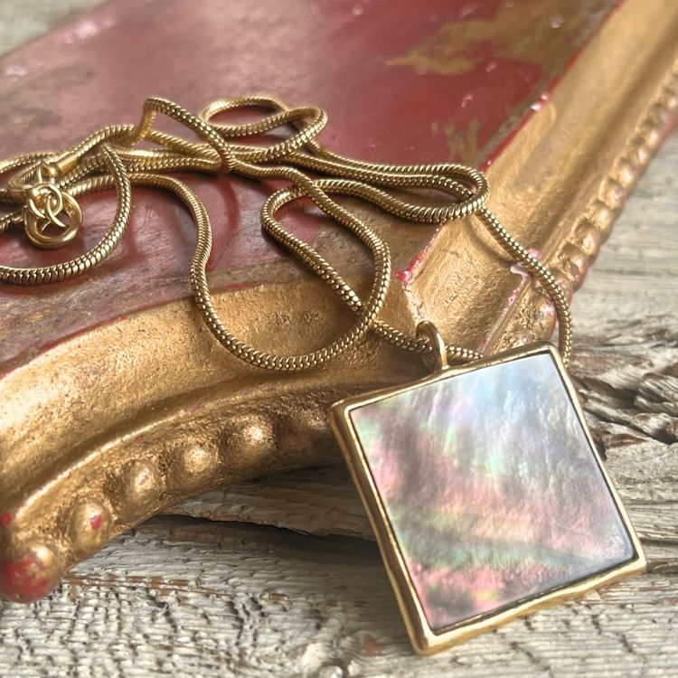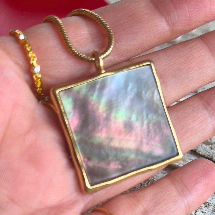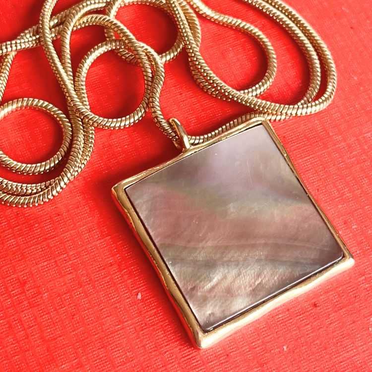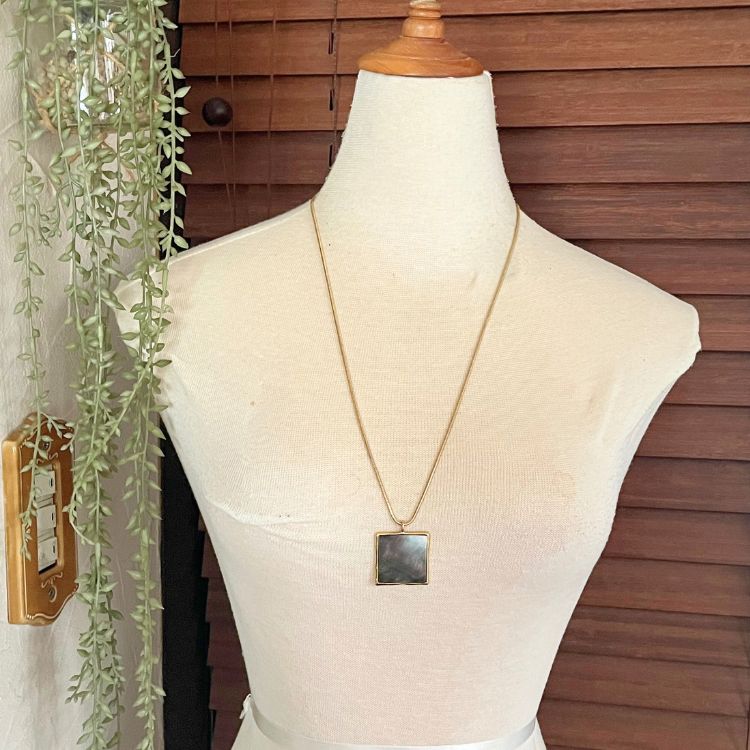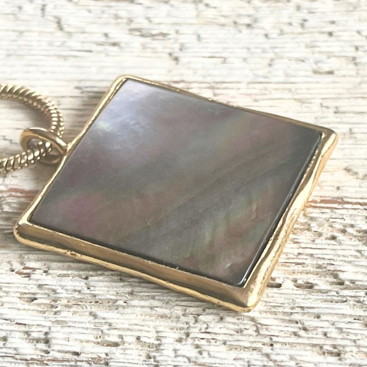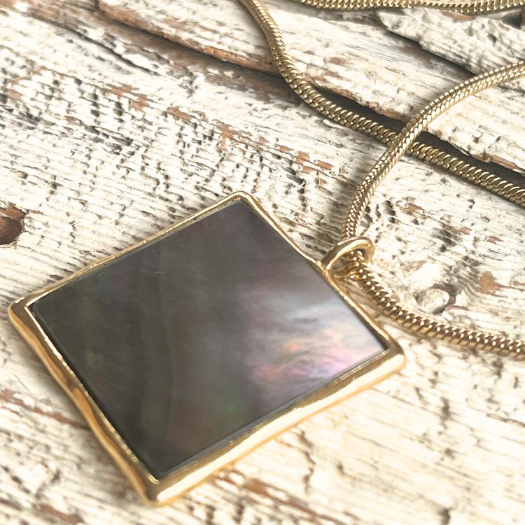 スクエアカットされたブラックマザーオブパールが主役になったネックレスになります。