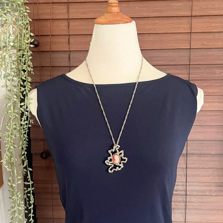 大胆なラインを描いたアーティスティックなフレームの中に、オレンジベースのカメオがアクセントされたネックレスになります。