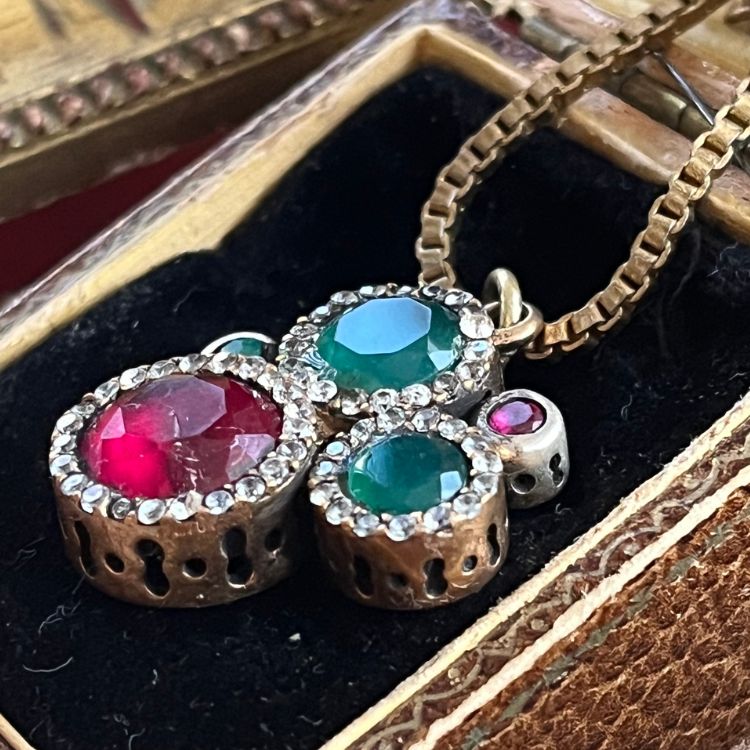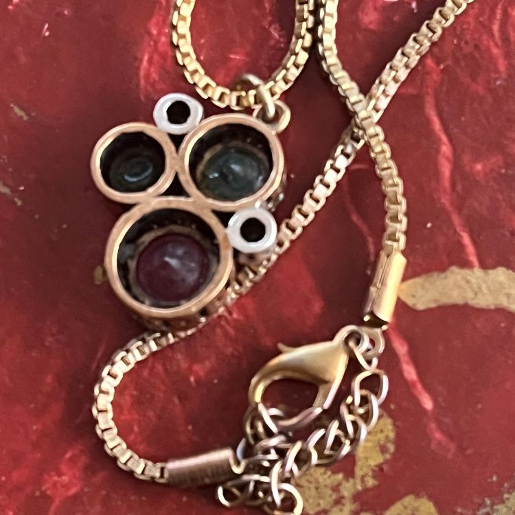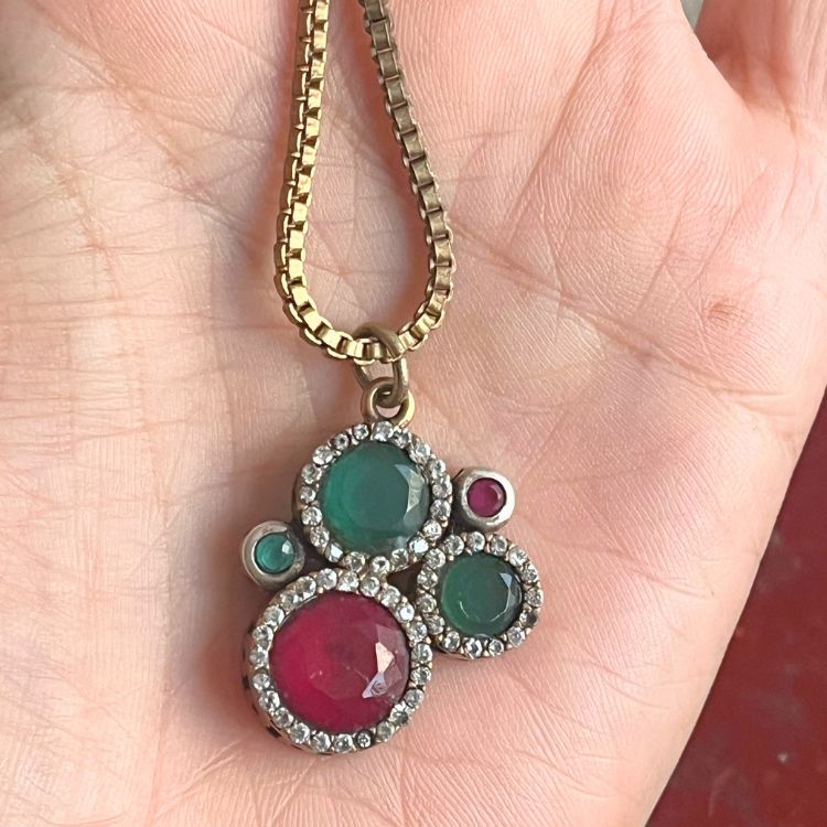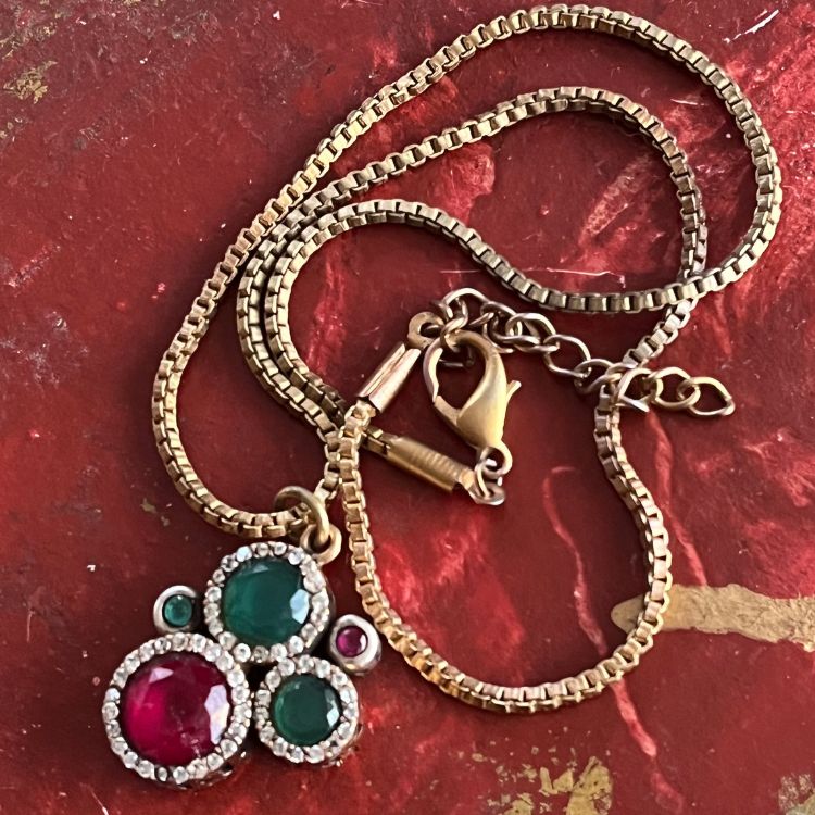 不確かですが、エメラルド×ルビーと思われるストーンがアクセントされたネックレスになります。