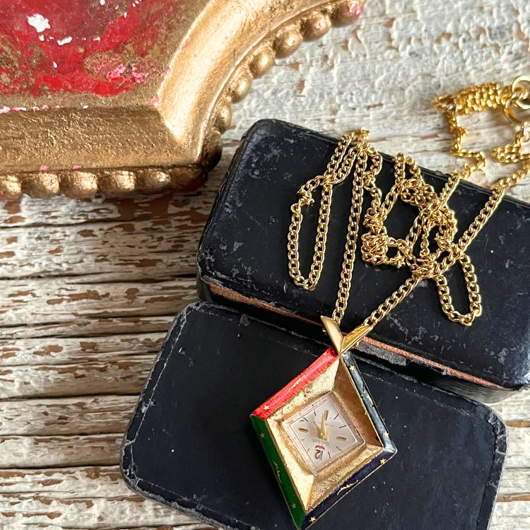 懐中時計同様、首から下げてトップを持ち上げて見た時に12が頂点に来るデザインなので、正面から見ると上下逆さになっているのが趣深いデザインですね。