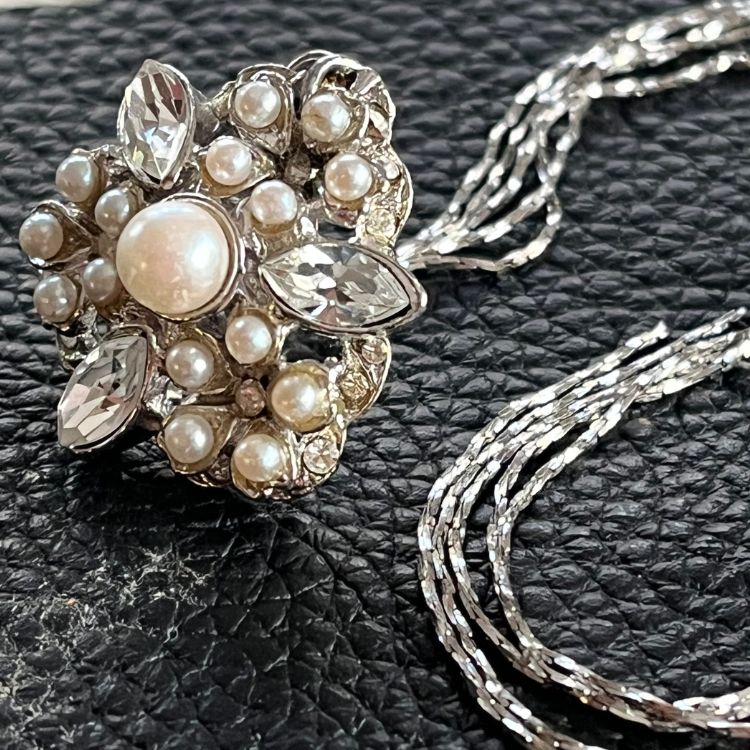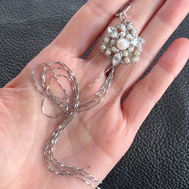 パールとビジュでデザインされた優しいカーブを描くトライアングルの下に、5連の極細シルバーチェーンが揺れる逸品です