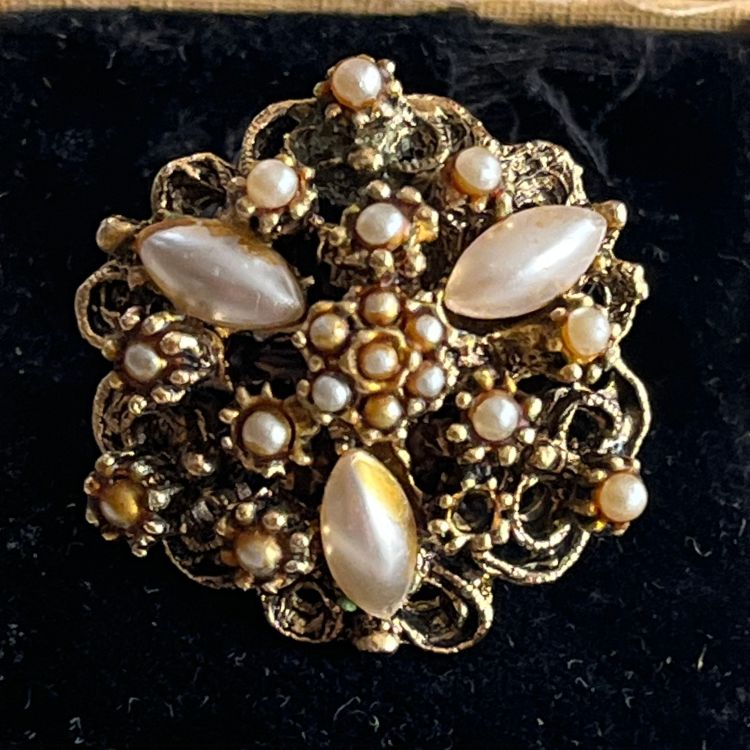 極小パールとマーキスパールで華やかさを演出し、アール・ヌーヴォー調の重厚感あふれる逸品です。