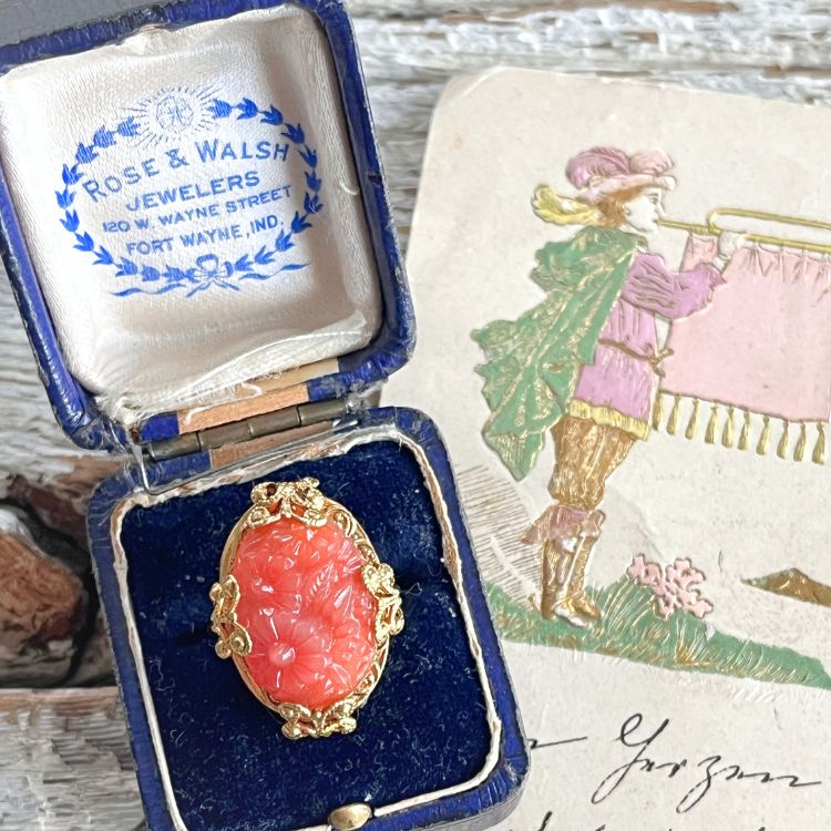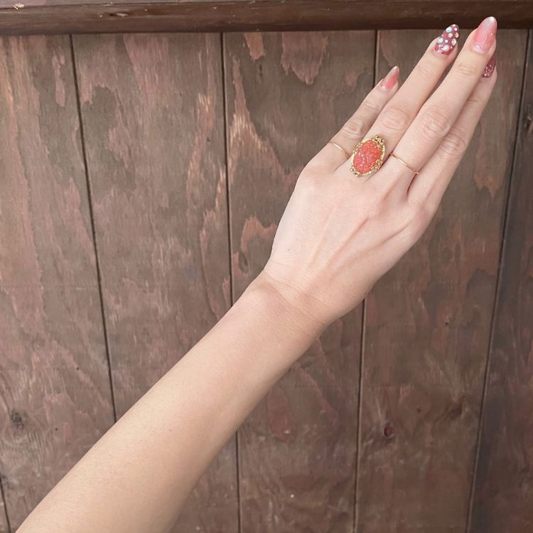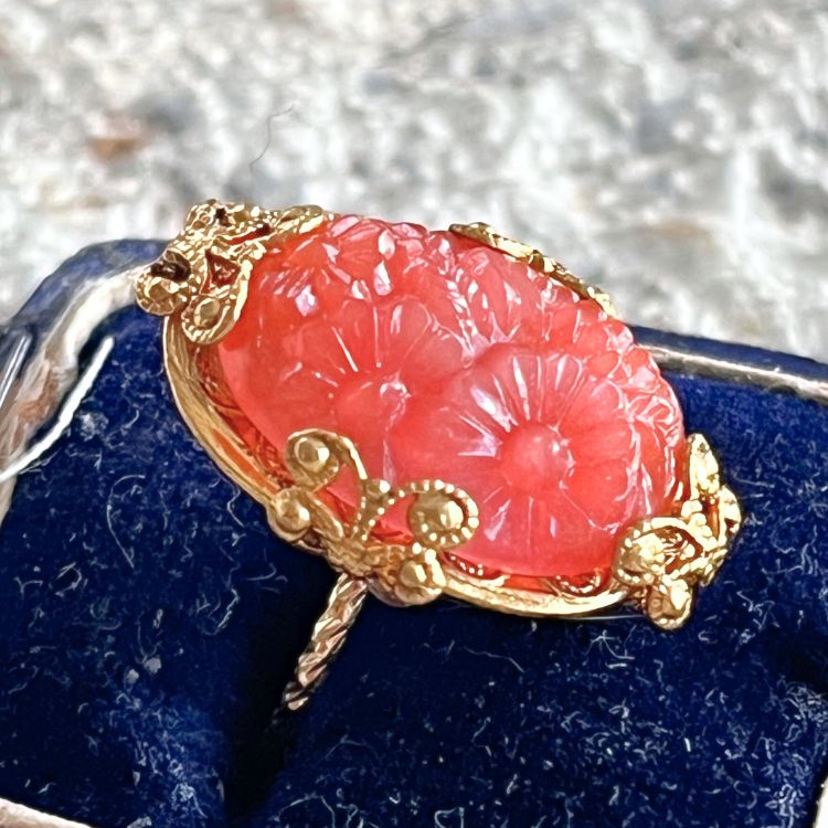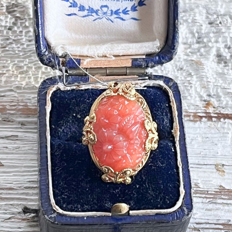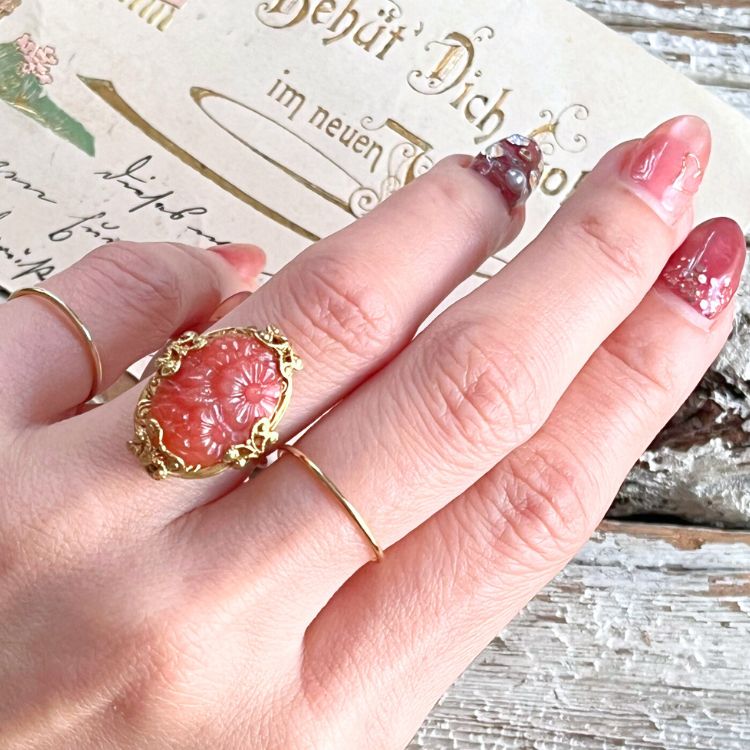 【リング】セルロイド コーラルピンク 花彫りカボション 40’sイギリス
