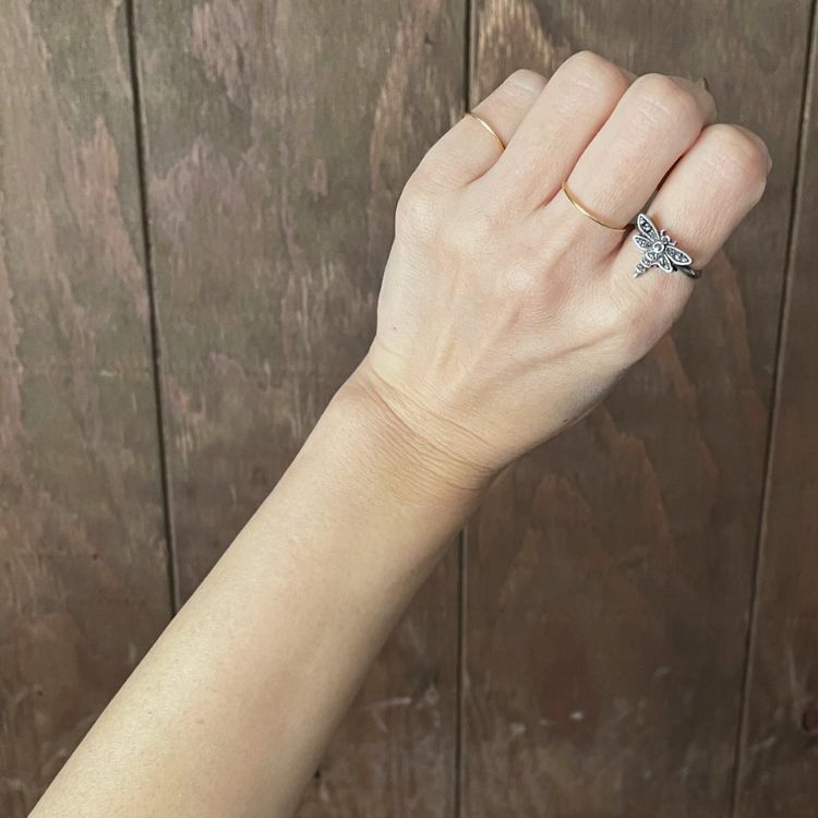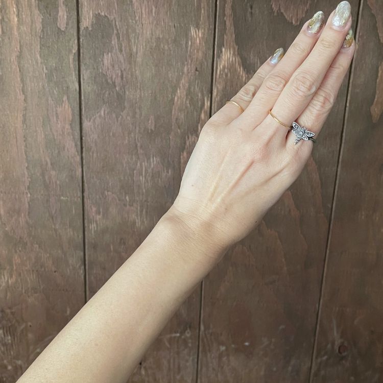 トンボのサイズ感も控えめでさり気なくて、愛らしいのに高級感のあるリングですね。